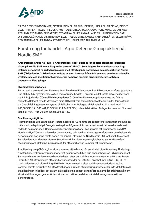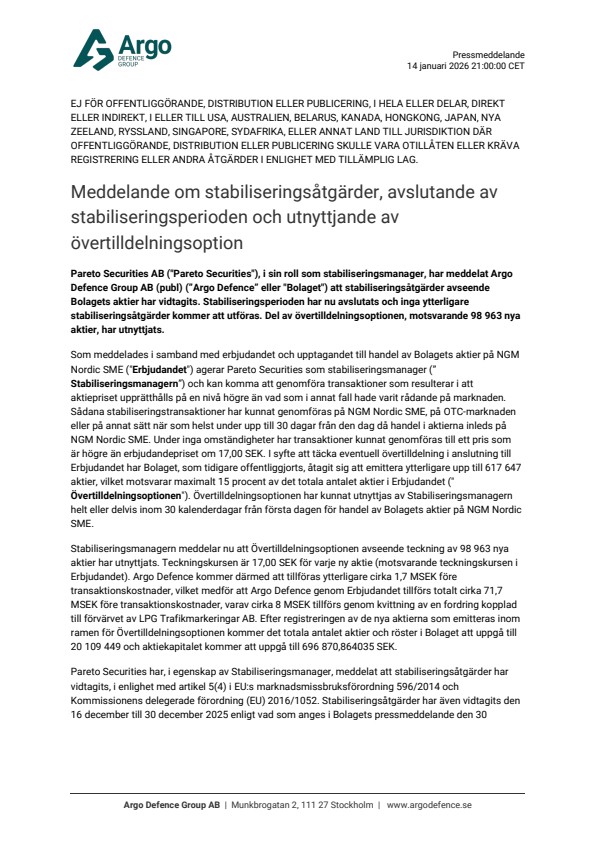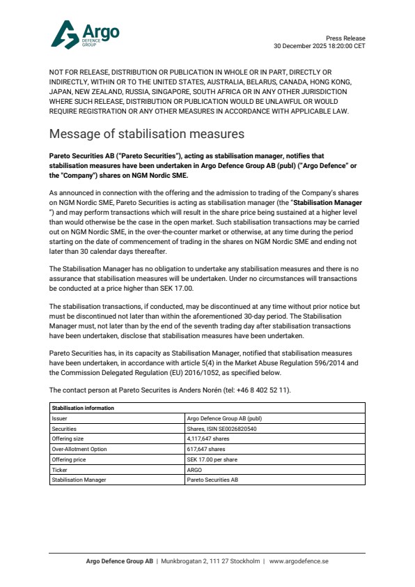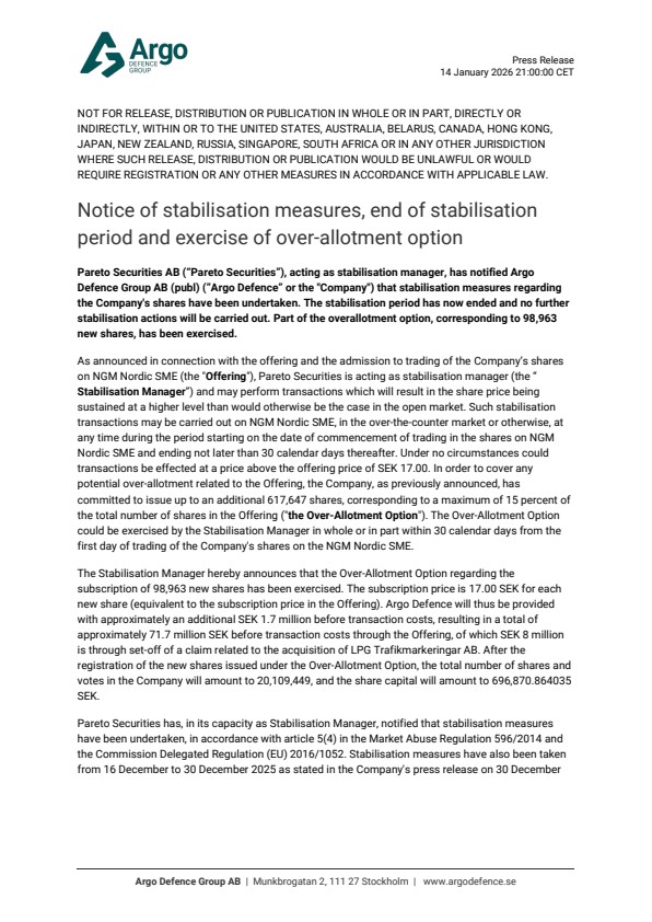 Pareto Securities AB (“Pareto Securities”), acting as stabilisation manager, has notified Argo Defence Group AB (publ) (”Argo Defence” or the “Company”) that stabilisation measures regarding the Company’s shares have been undertaken. The stabilisation period has now ended and no further stabilisation actions will be carried out. Part of the overallotment option, corresponding to 98,963 new shares, has been exercised.