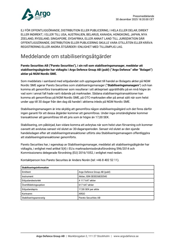 Pareto Securities AB (“Pareto Securities”), i sin roll som stabiliseringsmanager, meddelar att stabiliseringsåtgärder har vidtagits i Argo Defence Group AB (publ) (”Argo Defence” eller ”Bolaget”) aktier på NGM Nordic SME.